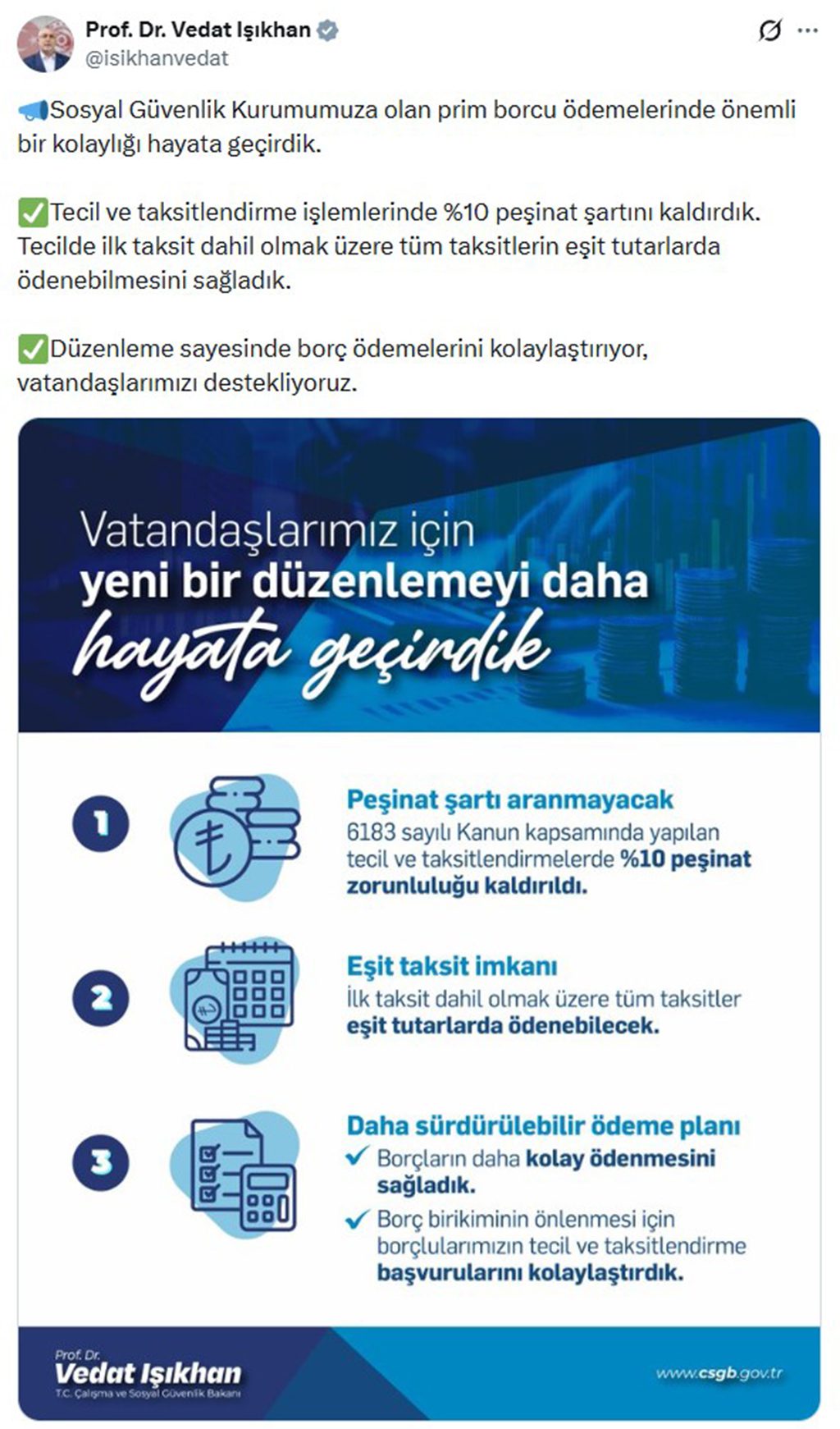 Çalışma ve Sosyal Güvenlik Bakanı Vedat Işıkhan şahsi sosyal medya hesabı üzerinden yaptığı açıklama ile SGK prim borcu tecil ve taksitlendirme işlemlerine yönelik yeni detayları duyurdu.