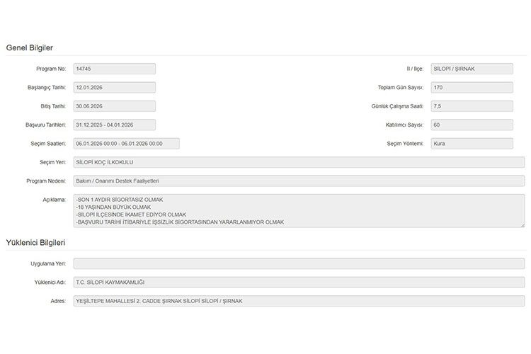 İşe alınacak kişilerin liste yöntemi üzerinden kura çekimi ile belirleneceği Silopi Kaymakamlığı İUP ile 60 personel alımı kura çekimi ise 6 Ocak 2026 tarihinde Silopi Kaymakamlığı’nda gerçekleştirilecektir.