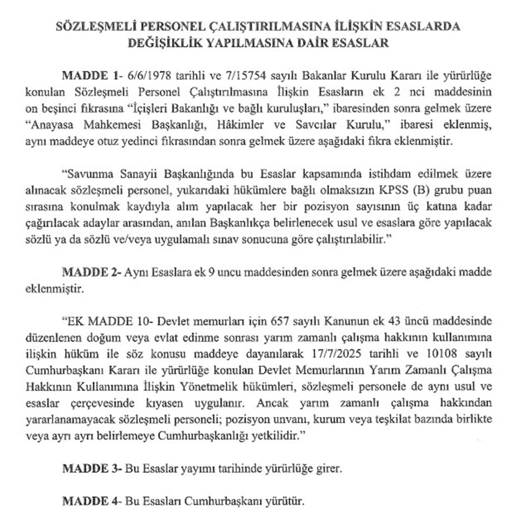 EK MADDE 10- Devlet memurlan için 657 sayılı Kanunun ek 43 üncü maddesinde düzenlenen doğum veya evlat edinme sonrası yarım zamanlı çalışma hakkının kullanımına ilişkin hüküm ile söz konusu maddeye dayanılarak 17/7/2025 tarihli ve 10108 sayılı Cumhurbaşkanı Karan ile yürürlüğe konulan Devlet Memurlannın Yarım Zamanlı Çalışma Hakkının Kullanımına İlişkin Yönetmelik hükümleri, sözleşmeli personele de aynı usul ve esaslar çerçevesinde kıyasen uygulanır. Ancak yarım zamanlı çalışma hakkından yararlanamayacak sözleşmeli personeli; pozisyon unvanı, kurum veya teşkilat bazında birlikte veya ayn ayrı belirlemeye Cumhurbaşkanlığı yetkilidir.”