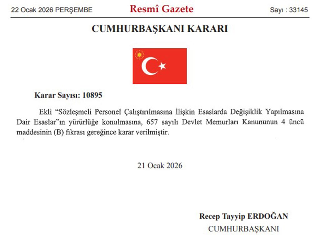 22 Ocak 2026 Tarihli ve 33145 Sayılı Resmi Gazete yayımlanan Cumhurbaşkanı Kararı kapsamına göre; sözleşmeli personel çalıştırılmasına ilişkin esaslar değiştirildi. İlgili kararın tam metni kamuhaberx.com’da paylaşıldı.