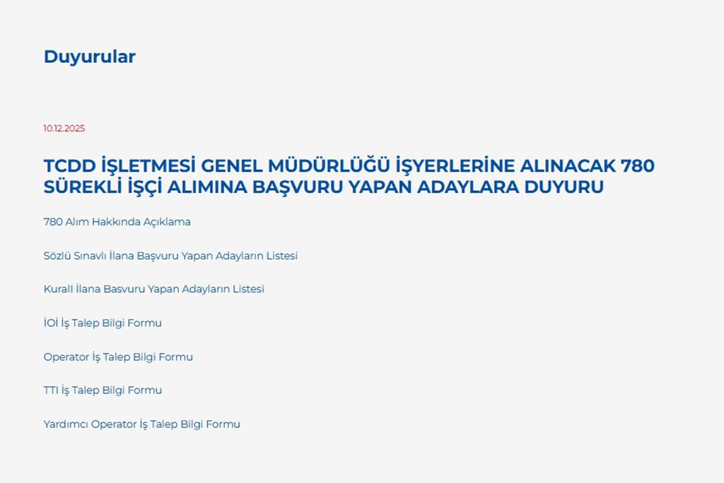 Türkiye Cumhuriyeti Devlet Demiryolları bünyesinde istihdam edilecek 780 sürekli işçi alımı kapsamında yeni bir gelişme yaşandı. TCDD 780 işçi alımı kura ve sınav süreci hakkında yeni duyuru yayımlandı. Bilindiği üzere, 17 Kasım – 21 Kasım 2025 tarihleri arasında işçi pozisyonlarına iş başvurusu alınmıştı.