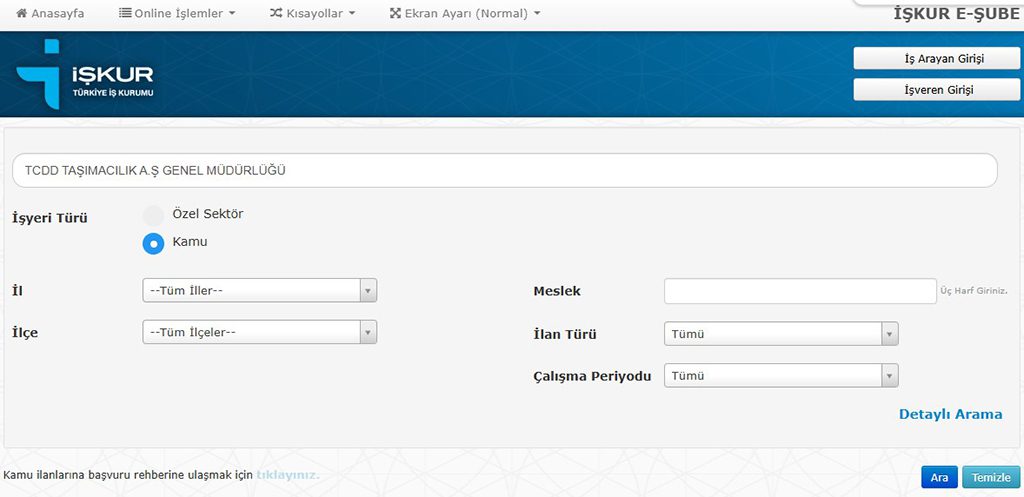 “https://esube.iskur.gov.tr/Istihdam/AcikIsIlanAra.aspx” ekranına giriş yaparak, arama kısmına “TCDD TAŞIMACILIK A.Ş GENEL MÜDÜRLÜĞÜ” yazmanız ve ara tuşuna tıklayarak ilanları görüntülemeniz mümkündür.
