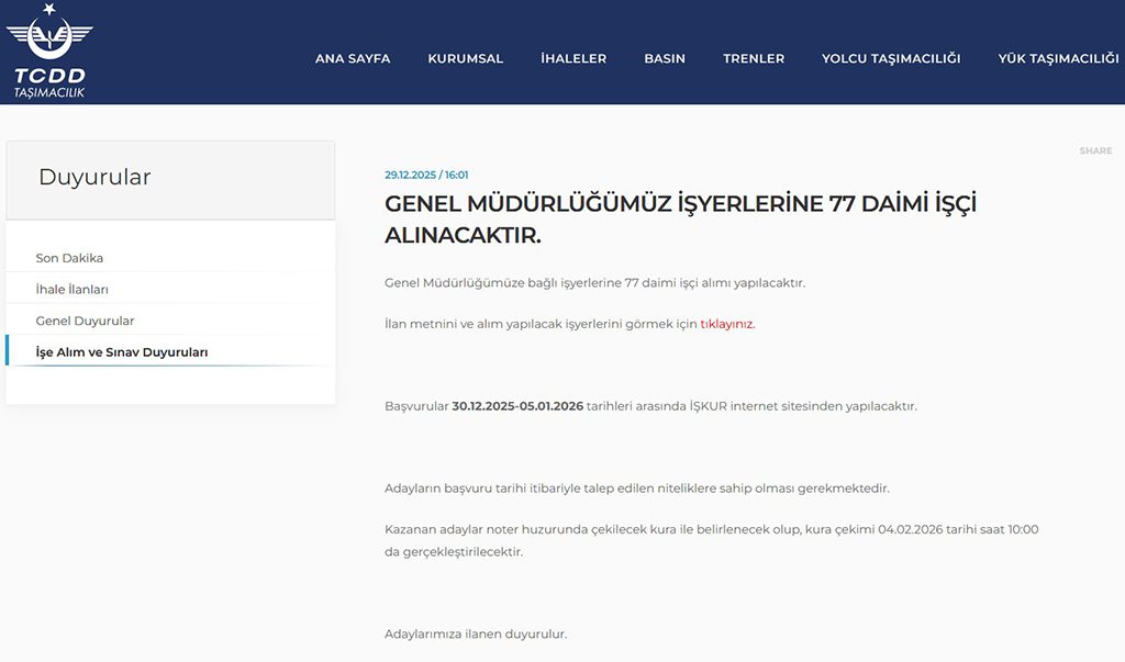 İşe alımlar noter kurası ile gerçekleştirilecektir. 04 Şubat 2026 tarihinde saat 10:00’da TCDD Taşımacılık Genel Müdürlüğü bünyesinde kura çekimi yapılacaktır.