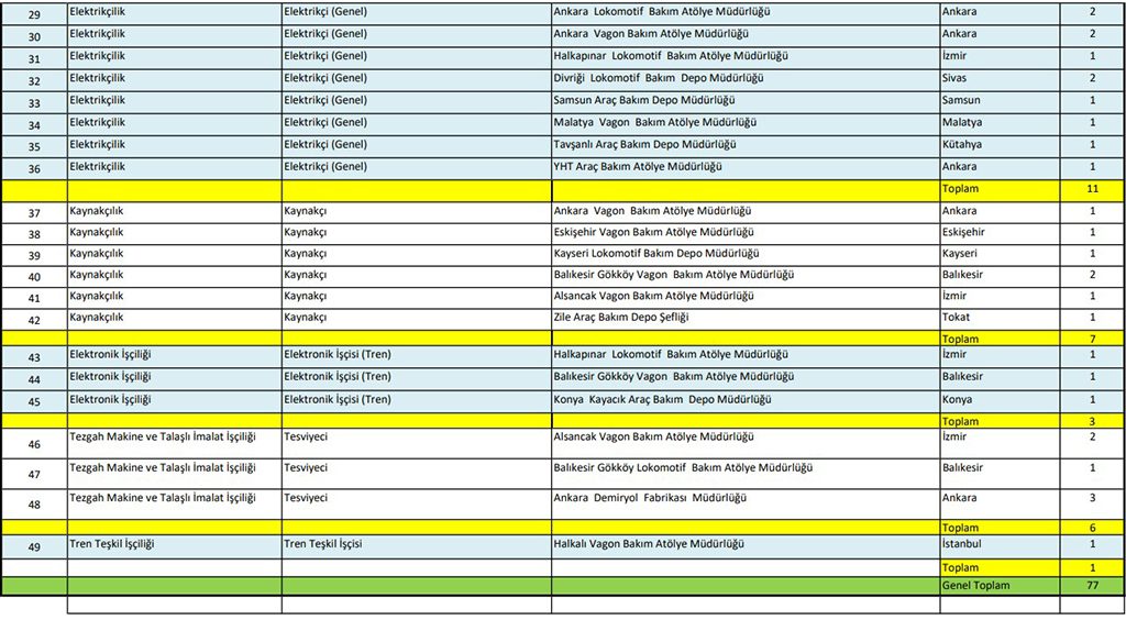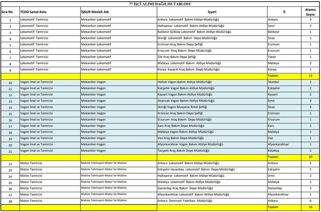 TCDD Taşımacılık 77 işçi alımı kadro dağılımı şu şekildedir;