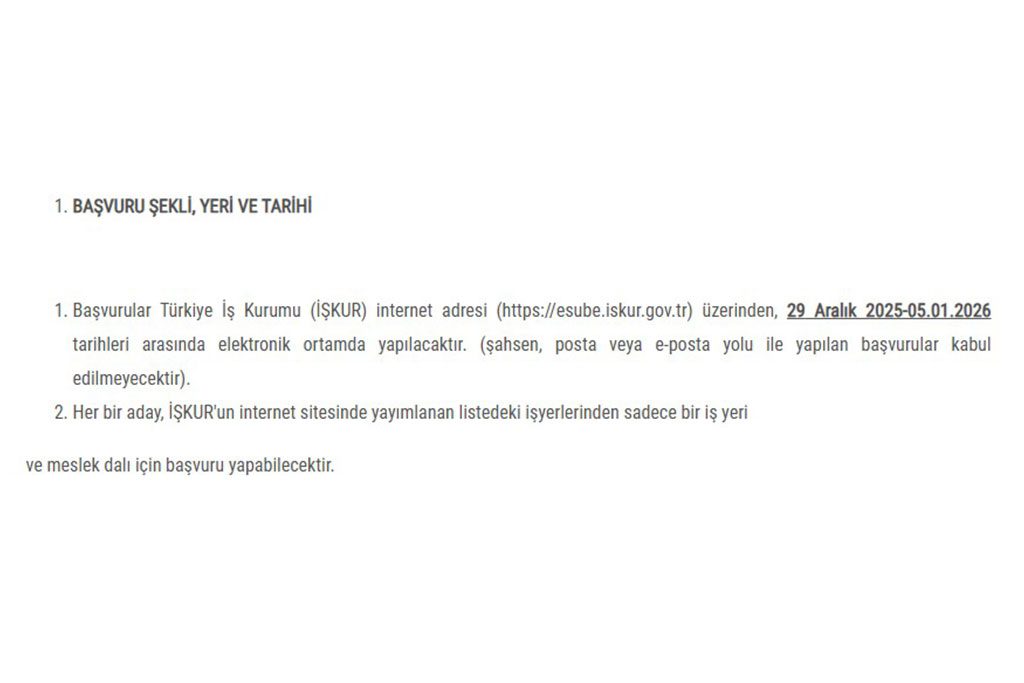 Türkiye İş Kurumu (İŞKUR) üzerinden alınacak başvuruların 29 Aralık 2025 tarihinde alınmaya başlandığı ve 5 Ocak 2026 tarihinde sona ereceği duyuruldu.