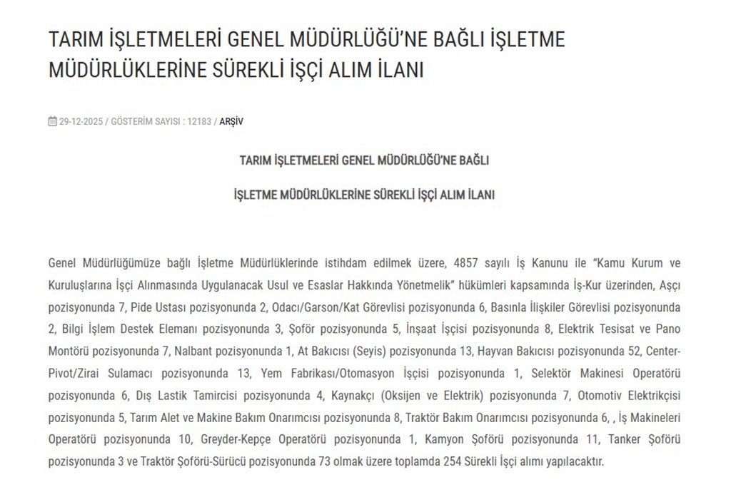 Tarım ve Orman Bakanlığı’na bağlı hizmet veren Tarım İşletmeleri Genel Müdürlüğü (TİGEM) tarafından yayınlanan son duyuruya göre, personel alımı gerçekleştirilecektir. TİGEM 254 personel alımı kapsamında; kadro dağılımı, başvuru tarihleri, başvuru süreci ve başvuru şartları açıklandı.