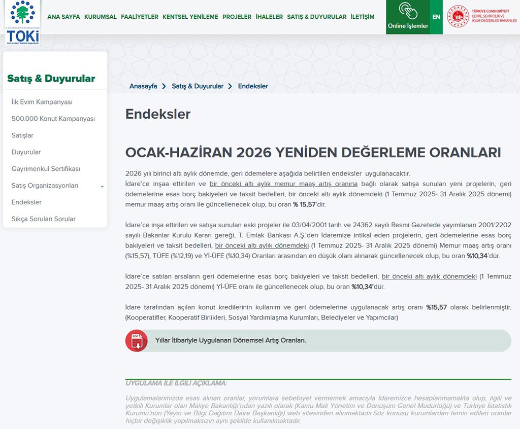 TOKİ tarafından açılan konut kredilerinin kullanımları ve geri ödemelerine yönelik uygulanacak artış oranı ise yüzde 15,57 olarak bildirildi.