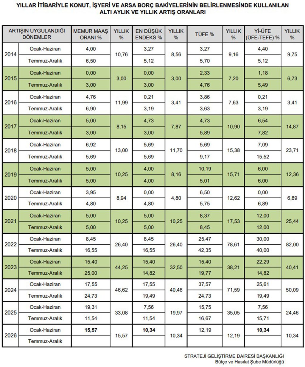 1 Temmuz 2025 – 31 Aralık 2025 dönemi (bir önceki altı aylık dönem) memur maaş artış oranı yüzde 15,57, TÜFE yüzde 12,19 ve Yİ-ÜFE ise yüzde 10,34 baz alınarak, oranlar arasından en düşük olan oran dikkate alınarak güncelleme yapılacaktır ve bu oran yüzde 10,34 olarak duyurulmuştur.