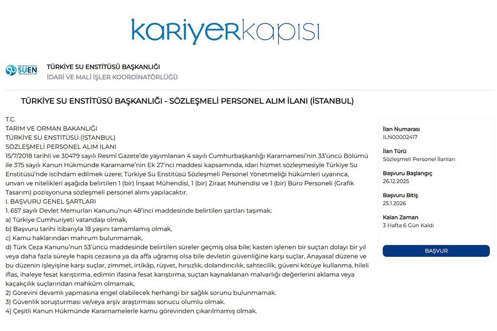 Sözleşmeli personel alımı ile ilgili yeni bir gelişme yaşandı ve Türkiye Su Enstitüsü 3 personel alımı yapacağını bildirdi. 26 Aralık 2025 tarihinde başvuruların alınmaya başlandığı iş ilanı için belirtilen son başvuru tarihi ise; 25 Ocak 2026 olarak duyuruldu. İşte Türkiye Su Enstitüsü personel alımı başvuru şartları, evrakları ve kadro bilgileri.